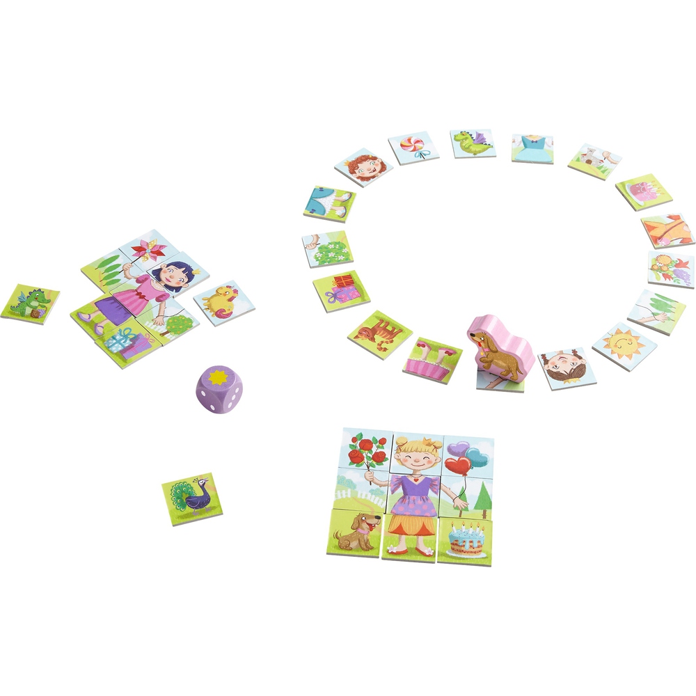Les quatre princesses organisent un pique-nique d’anniversaire dans le jardin du château. Mais, elles ne sont pas encore prêtes. Quel pêle-mêle dans leurs vêtements et les accessoires de fête ! Qui veut bien aider le petit chien Charly à retrouver dans le jardin les princesses et les accessoires pour la fête ? Le premier à assembler neuf pièces et à composer un puzzle de princesse complet a gagné.