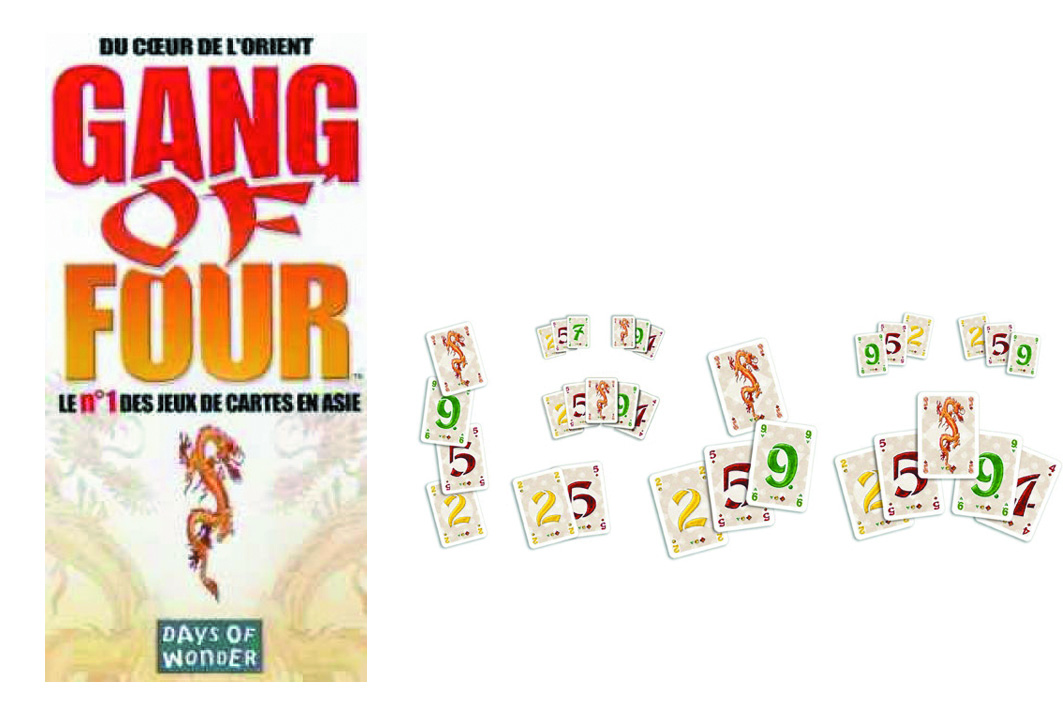 Découvrez le pays des mille délices ! La Chine est une terre exotique, mais aussi une terre de pouvoir, de luttes sanglantes et de trahisons infâmes. Là-bas, la politique y est une chose sérieuse, et elle ne laisse pas de place aux faibles. Gang of four est un jeu de pouvoir aux origines chinoises (dérivé du Choh Dai Di, un jeu de carte aussi vieux que Confucius) où les joueurs vont s’affronter avec des cartes et tenter d’éliminer leurs adversaires. Tous les coups fourrés sont permis, et seuls les plus machiavéliques pourront devenir de plus en plus forts. Voici donc la troisième édition du jeu, lancée par un jeune éditeur dynamique et plein d’idée (qui vient aussi de sortir Aux pierres du dragon). Cette nouvelle édition dispose d’un look assagi et attractif, bien moins maoïste que notre version de l’année dernière (tout de même un tantinet provocante...). Entrez dans le pavillon des mille senteurs. Chaque joueur possède une main de 16 cartes dont il va falloir être le premier à se débarrasser en posant différentes combinaisons de cartes. À chaque fois qu’une combinaison de cartes est posée, le joueur suivant doit surenchérir en en posant une plus forte. S’il ne peut le faire, il passe son tour, et perd ainsi sa chance de se défausser de quelques cartes. Lorsque l’un des joueurs à posé sa dernière carte, la manche se termine et l’on compte les points. Puis on redémarre une nouvelle manche jusqu’à ce qu’un joueur atteigne 100 points. Gang of Four est un jeu édité par Day of wonder.