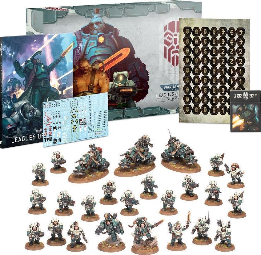 Les Ligues de Votann ont émergé des profondeurs du cœur de la galaxie. Affronter leurs armées au combat revient à lutter contre une avalanche blindée écrasant tout sur son passage. C’est être évalué puis brutalement éliminé par des assaillants qui ne vous voient que comme un obstacle sur la route de leur profit. Ou pire, comme un de leurs ennemis honnis dont l’annihilation doit être garantie à tout prix. Pour leurs partenaires dans le commerce et au combat, les Cognats sont d’inestimables alliés. Mais ceux qu’ils considèrent être une menace pesant sur la survie des leurs risquent la destruction, appliquée avec la même implacable rigueur qui caractérise toutes les entreprises des Cognats. Le Set d’Armée des Ligues de Votann rassemble les nouvelles figurines des Ligues de Votann, et constitue votre première occasion de mettre la main sur la dernière faction à faire son entrée dans le 41e Millénaire. Menez votre Ost-cognat avec Ûthar le Destiné, ou un puissant Kâhl, soutenu par un Champion Einhyr, trois Pionniers Hernkogs et 20 Guerriers Âtrekogs pouvant être divisés en deux unités de 10 pour constituer une armée prête à se jeter au combat en un Détachement de Patrouille. Ce set est également votre première occasion de vous procurer le Codex : Leagues of Votann, un livre de 104 pages plein d’historique et de règles pour cette toute nouvelle armée. Cette édition limitée exclusive est uniquement disponible dans ce set d’armée et s’accompagne de 50 cartes techniques des Ligues de Votann, une planche de 63 jetons double face pour suivre vos aptitudes, ainsi que de deux planches de décalcomanies rassemblant un total de plus de 1000 runes, icônes et numéros. Cette boîte est votre porte d’entrée dans l’histoire de Warhammer en rejoignant l’avant-garde des Ligues de Votann. Ce set contient les figurines plastiques suivantes : – 1x Ûthar le Destiné, pouvant également être assemblé comme Kâhl – 1x Champion Einhyr – 3x Pionniers Hernkogs – 20x Guerriers Âtrekogs Contient également : – Codex : Leagues of Votann – Livre à couverture rigide de 104 pages aux illustrations brillantes et à la couverture veloutée en édition limitée – Cartes Techniques : Ligues de Votann – 50 cartes dont 7 Stratagèmes de base, 31 Stratagèmes des Ligues de Votann, 5 Stratagèmes propres aux Ligues, 6 pouvoirs psychiques de la Discipline Forgetrame, et 1 pouvoir psychique Châtiment – 2x planches de décalcomanies des Ligues de Votann, contenant chacune 555 décalcos différentes. Toutes les figurines sont fournies avec leurs socles correspondants. Ces figurines sont fournies non peintes et nécessitent assemblage – nous recommandons d’employer la Colle Plastique Citadel et la peinture Citadel.