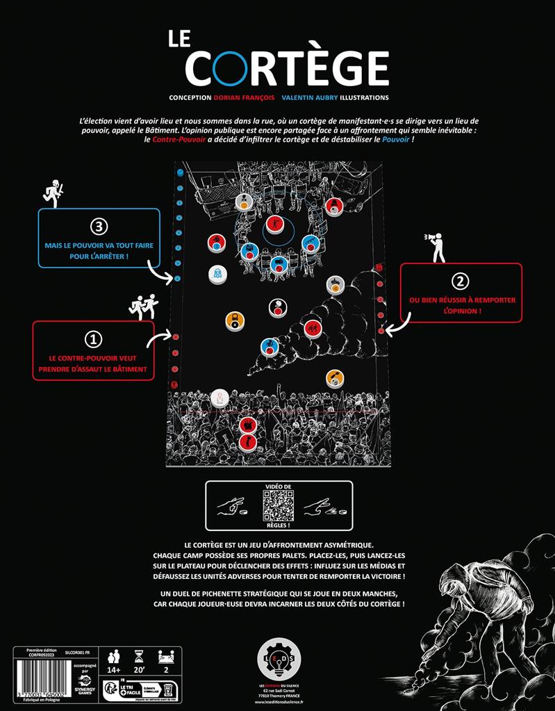 Le Cortège est un jeu atypique et immersif : un duel de pichenette tactique sur le thème de la manifestation ! Une personne y incarne le Contre-Pouvoir et l’autre le Pouvoir. Entre stratégie et adresse, déplacez vos unités sur le plateau de jeu pour tenter de remporter la victoire : le Contre-Pouvoir peut gagner en prenant possession du Bâtiment ou bien en remportant l’Opinion, tandis que le Pouvoir gagne en l’arrêtant. Une partie se joue en deux manches, car chaque joueur·euse devra incarner les deux côtés du Cortège !