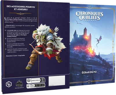 L’écran est le principal accessoire destiné au MJ de Chroniques Oubliées Fantasy. Offrant aux joueurs un visuel inspirant, il fournit au MJ un résumé des points de règles les plus utilisés en partie. L’Écran du MJ est accompagné des accessoires suivants destinés aux joueurs : - Le Livret des voies, qui regroupe une version synthétique de toutes les capacités des voies de peuple, de profil et de prestige figurant dans le Livre de règles de Chroniques Oubliées Fantasy. - 8 rectos préremplis de la feuille de PJ, correspondant chacun à l’un des peuples de base. - 14 versos préremplis de la feuille de PJ, correspondant chacun à l’un des profils. - 4 planches de pions, contenant au total 120 pions « point de vigueur » et 40 pions « point de mana ».