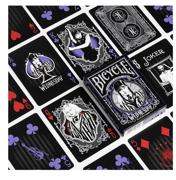 Plongez dans le monde sombre de Nevermore Academy avec Bicycle Wednesday cartes à jouer ! Inspiré de la série à succès de Netflix mettant en vedette Jenna Ortega dans le rôle de Wednesday Addams ; votre prochain jeu de cartes est entièrement dédié à la danse palpitante avec le macabre, alors que vous mélangez les cartes noires d’encre présentant les personnages favoris des fans de la série.