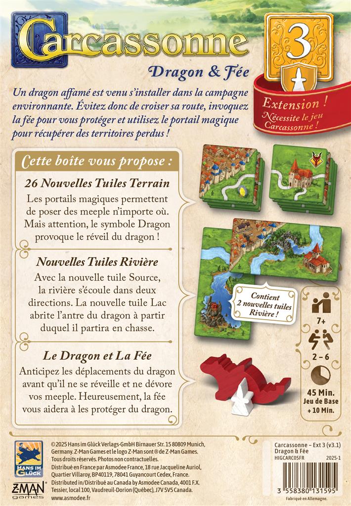 Avec l’extension Carcassonne Dragon & Fée, découvrez de nouvelles mécaniques. Anticipez les déplacements du dragon avant qu’il ne se réveille et ne dévore vos meeple. Heureusement, la fée vous aidera à les protéger. Avec la nouvelle tuile Source, la rivière s’écoule dans deux direction. La nouvelle tuile Lac abrite l’antre du dragon. Enfin, les portails magiques permettent de poser des meeple n’importe où : mais attention au symbole Dragon qui provoque le réveil de la bête.