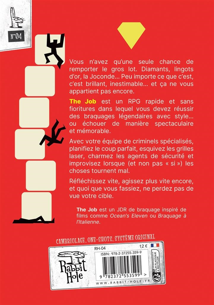 The Job est un jeu de rôles où les joueurs tentent de réussir un incroyable cambriolage, sous le contrôle du maître de jeu. Un scénario se joue à peu près en 3 heures, divisées en deux phases. Commencez chacun par choisir l’un des 8 rôles proposés (Acrobate, Arnaqueur, Brute, Chauffeur, etc). Durant la première, la préparation, ils vont planifier, avec l’aide de l’arbitre, 12 scènes qui vont constituer le braquage, en prenant en compte les difficultés et les complications auxquelles ils voudront se confronter.