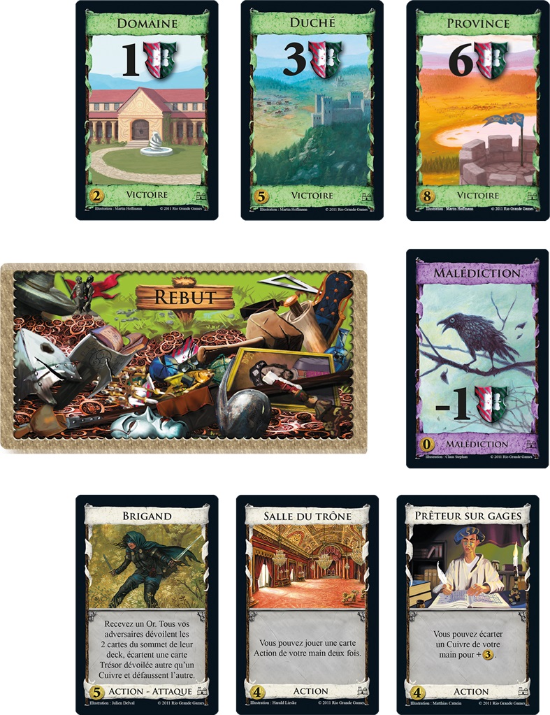 C’est un jeu de deck-building : chaque joueur commence avec un petit deck identique, composé de cartes « Trésor » (argent) et de cartes « Domaine » (points de victoire).