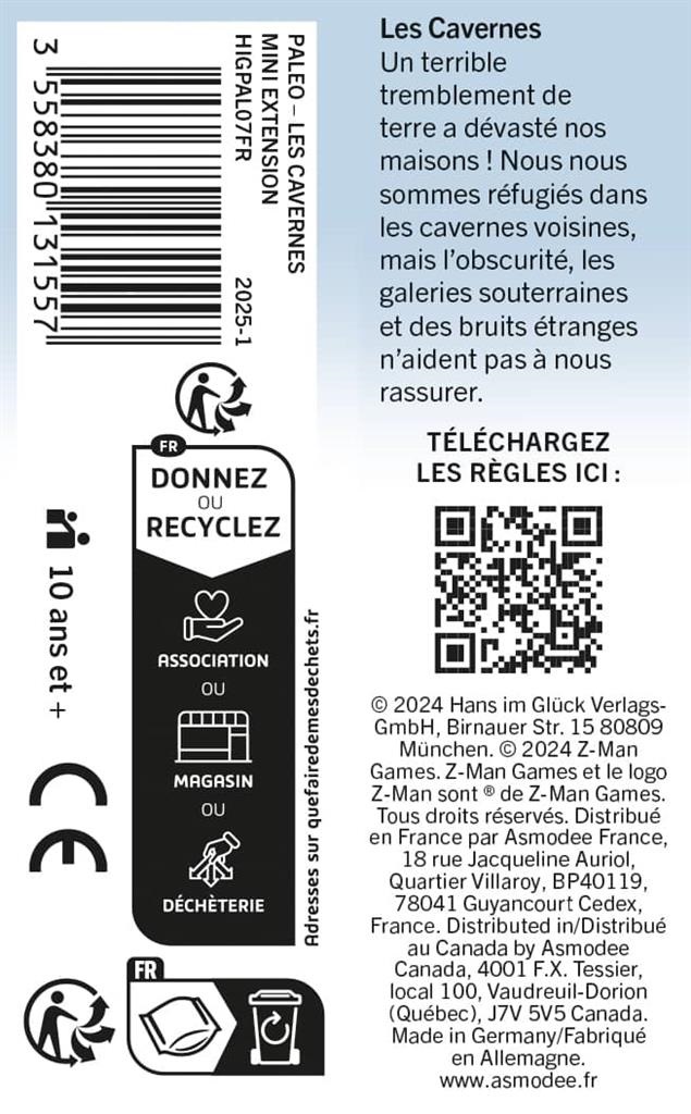 Un terrible tremblement de terre a détruit votre foyer. Il ne vous reste qu’un refuge : les cavernes voisines. Mais l’obscurité, les échos et les bruits étranges n’ont rien de rassurant… Paleo : Les Cavernes est une mini-extension pour Paleo, le jeu coopératif multi-primé qui vous plonge à l’âge de pierre.