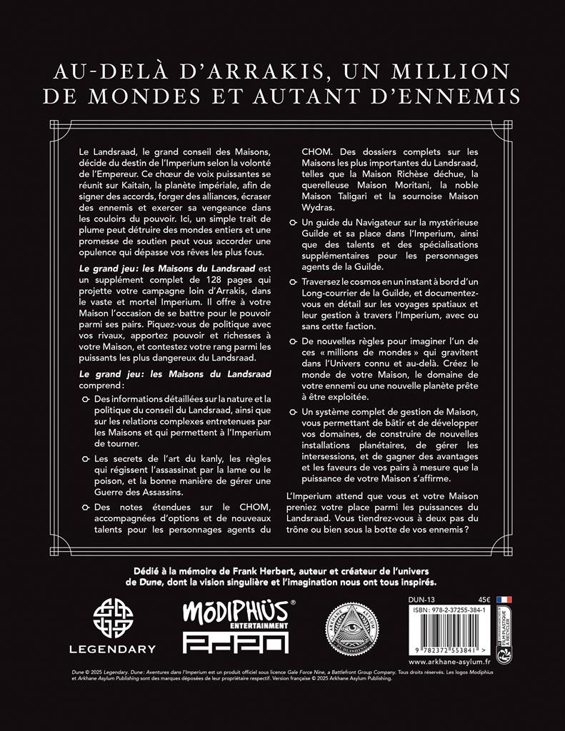 Vous y trouverez des informations sur le fonctionnement du Landsraad et sur les relations politiques complexes entre les maisons. Vous apprendrez les secrets du Kanly, l’art de l’assassinat par la lame et le poison, lirez de nombreux détails sur le CHOM ainsi que des dossiers sur les maisons les plus importantes du Landsraad, voyagerez dans le cosmos à bord de longs courriers de la guilde, utiliserez des règles pour imaginer de nombreuses nouvelles planètes, gérerez votre maison avec un système complet de gestion, etc.