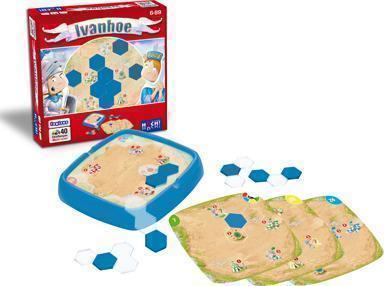 Le prince essaie de retrouver sa princesse mais il doit d’abord prouver sa bravoure en remplissant 5 défis sur son chemin ! Le jeu contient 40 énigmes de 3 niveaux de difficulté. Les 6 pièces sont en partie transparentes et en partie opaques, trouvez le bon endroit pour les placer et créer le bon chemin ! Les premières missions contiennent des indices pour aider le joueur. Le plateau de jeu s’ouvre et permet de ranger les missions, Ivanhoe est donc un jeu idéal en voyage !