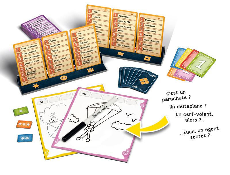 Matériel : 6 ardoises pour dessiner ; 6 marqueurs effaçables ; 6 chiffons pour effacer ; 6 lots de 5 jetons Score ; 6 lots de 7 cartes Pari ; 13 cartes Noires ; 5 jetons Bonus ; 99 cartes Mots recto-verso avec 4 niveaux de difficulté ; 2 présentoirs de cartes ; 1 livre de règles.