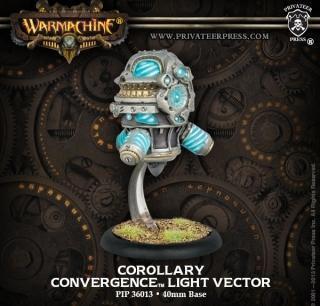 Unlike other vectors, whose primary function is to apply destructive force, the Corollary is designed to support its warcaster and allied forces in more complex ways. Its internal compartments house a suite of arcane accumulators that store the residual energies generated by a warcaster and his battlegroup in combat. These energies are captured by irises recessed in the Corollary’s hull and then dispensed at the warcaster’s command to empower other vectors, making the warcaster exponentially more efficient.