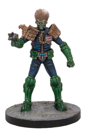 Résultat d’une expérience génétique dont même la Division Scientifique ne veut pas entendre parler, le Judge Dredd Martien représente une menace pour l’effort de guerre dans son ensemble ! Mortellement efficace, vêtu et armé comme le représentant de la justice, ce Martien fou ne reconnaît nulle autre autorité que la sienne et ne vise qu’à punir les contrevenants et à faire respecter la Loi, quoi qu’il en coûte !