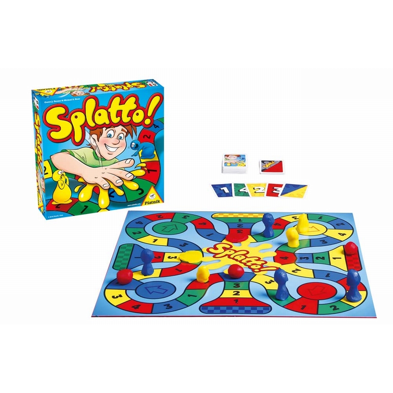 Un jeu qui sort de l’ordinaire ! Tu fais partie des joueurs qui ne supportent pas de voir les autres gagner ? Dans Splatto, mets tes adversaires à plat, au figuré mais surtout au sens propre grâce à la pâte Splatto ! Attention, cette envie suprême d’écraser tes adversaires ne doit pas te faire oublier d’avancer stratégiquement tes pions... sinon tu pourrais pâtir du même sort !