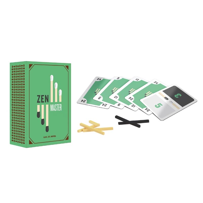 Règle du jeu : Distribue 9 cartes-nombre à chaque joueur, elles sont numérotées de 1 à 50. Retourne une carte score au centre, elle montre un chiffre blanc et un chiffre noir. A chaque tour, chaque joueur pose une de ses cartes-nombre. La plus haute et la plus basse remportent des allumettes blanches et noires suivant les chiffres de la carte-score. Aux manches suivantes, les allumettes noires et blanches récupérées s’’annulent. ZenMaster est un jeu rapide de tactique, de hasard et d’’ambiance.