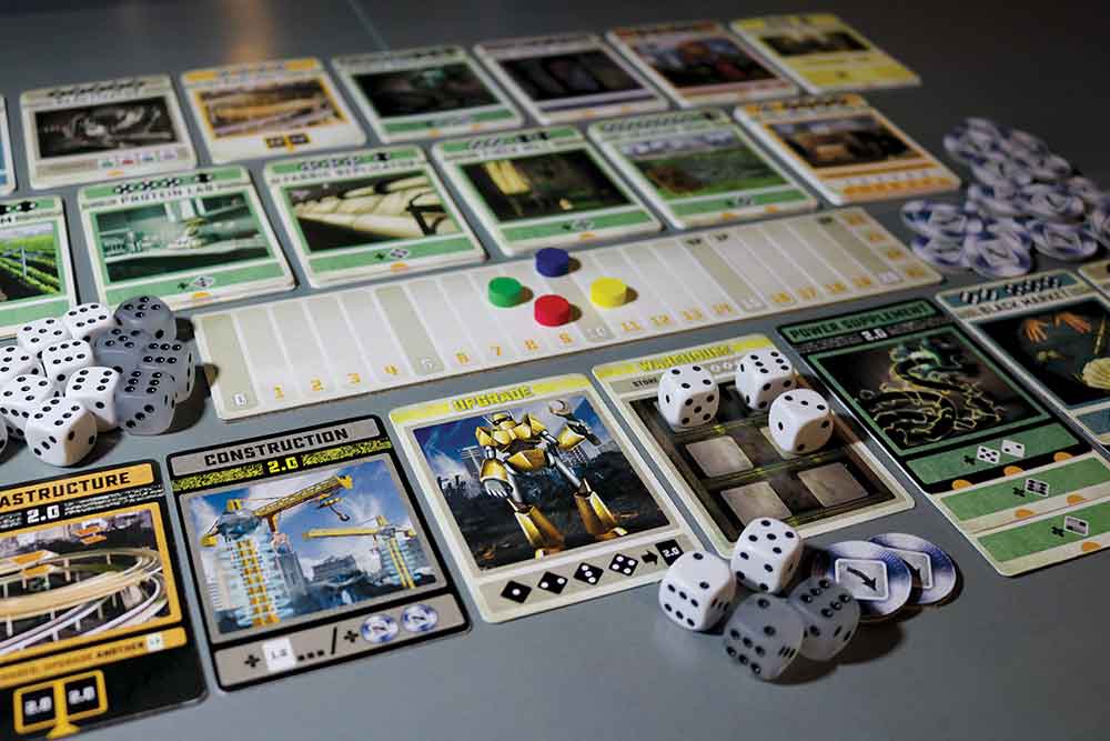 Use dice as resources to purchase buildings (cards) to expand your colony.