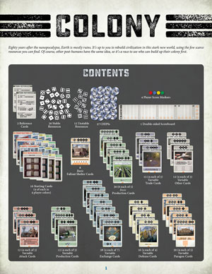 In Colony, each player constructs and upgrades buildings, while managing resources to grow their fledgling colony. In a clever twist, dice are used as resources, with each side/number representing a different resource. Some resources are stable, allowing them to be stored between turns, while others must be used right away. Buildings provide new capabilities, such as increased production, resource manipulation, and additional victory points. Using dice-as-resources facilitates a dynamic, ever-changing resources management mini-game while players work to earn victory points by adding building to their tableau on their way to victory.