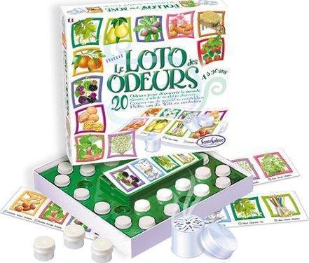 Un jeu éducatif avec 20 odeurs : amande, poire, crayon, cacahuète, cannelle, chocolat, encaustique, foin, fraise des bois, jasmin, mûre, noix, orange, figuier, réglisse, rhubarbe, terre mouillée, thé, thym, tilleul.