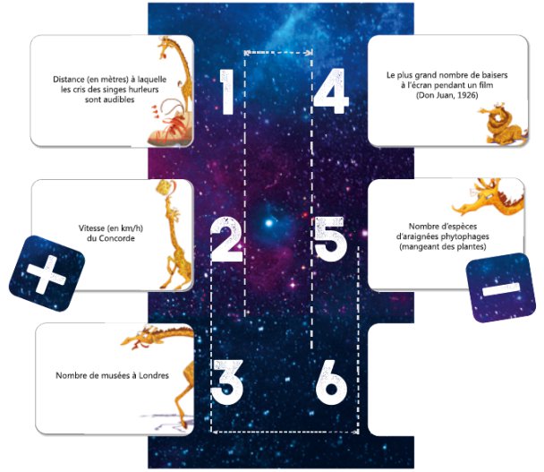 Les joueurs vont ensuite débattre, échanger leurs impressions et désigner la carte dont ils pensent que la réponse sera la valeur la plus importante. Ils placeront alors la tuile "+" devant cette carte, puis feront de même avec la tuile "-" qu’ils mettront sur la carte dont ils jugent la réponse être la valeur la plus faible.
