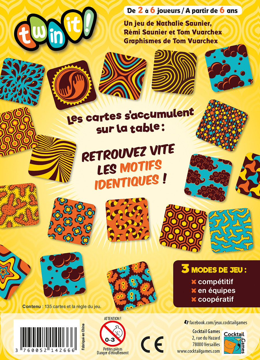Les cartes vont s’accumuler sur la table : retrouvez vite les motifs strictement identiques ! Certains sont même en triple ! 3 modes de jeu : compétitif, en équipes et coopératif.