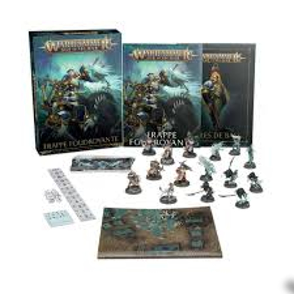 D’antiques squelettes et des cadavres putréfiés rampent hors de leur tertre à l’appel de la noire sorcellerie de Nagash, Seigneur Suprême des Morts-vivants. Plus ancien que tout ce qu’on peut concevoir, cruel et inimaginablement calculateur, Nagash veut remodeler les Royaumes Mortels à son image, et les transformer en un empire bien ordonné où n’existeraient que des serfs soumis à sa volonté. Dressés face à lui dans le fracas du tonnerre, les Stormcast Eternals, champions célestes de l’Ordre, sont prêts à affronter la menace dans un choc épique pour décider du sort du monde. C’est l’aube d’une ère nouvelle, promesse de guerre incessante aux batailles dantesques, une époque riche en héros et en monstres. Tel est l’Âge de Sigmar ! Introduction parfaite à Warhammer Age of Sigmar, et plus généralement au hobby de la collection, de l’assemblage, de la peinture et du jeu avec des figurines Citadel, Frappe Foudroyante est une boîte de base bourrée de figurines, de règles et d’accessoires qui vous permettront de vous lancer sans délai. Elle contient 15 figurines réparties entre les factions des preux Stormcast Eternals et des vils morts-vivants Nighthaunts – des ennemis jurés pris dans un combat sans merci – ainsi que des guides détaillés pour les assembler, les peindre et jouer avec elles.