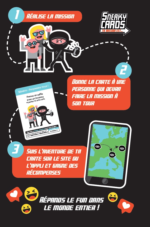 Réalisez chaque mission (offrir un cadeau sans raison, improviser un discours dans un ascenseur…) puis faites passer la carte à un complice involontaire, qui relèvera le défi à son tour ! Les grandes surprises et petites attentions vont envahir le monde, et cela commence par VOUS !