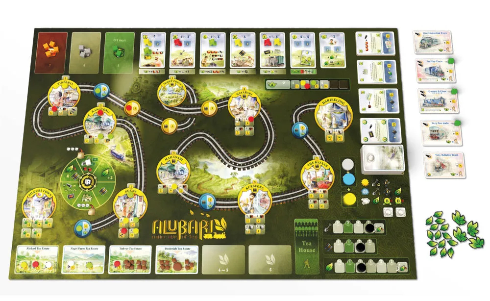 Darjeeling est une ville située dans le Petit Himalaya et est très réputée pour son industrie du thé. A Alubari, les joueurs s’affrontent pour cultiver et récolter leurs propres plantations de thé et participer à la construction du chemin de fer et des villes de Darjeeling. Lorsque le chemin de fer sera terminé, le joueur qui aura le plus contribué à l’élaboration de celui-ci sera déclaré vainqueur. La météo qui influe sur les actions des cartes, la disponibilité aléatoire des ressources et la fréquence des événements viendront affecter le rythme de la partie et feront d’Alubari un jeu avec un fort potentiel de rejouabilité.