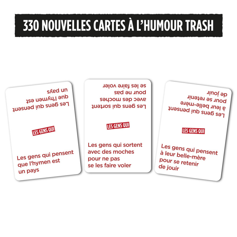Le jeu Les Gens Qui est de retour, avec une extension ! Alors que la version de base vous permet déjà de juger 440 situations énervantes du quotidien, en voici désormais 330 de plus, cette fois écrites avec beaucoup d’humour noir. (déconseillé aux moins de 18 ans) En bonus : • Un set de main supplémentaire : Le diable. • Des règles additionnelles pour un nouveau de mode jeu
