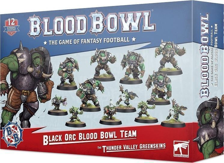 Depuis des années, on voit des Orques Noirs faire sécession pour former leurs propres équipes. Plus forts, plus rusés et plus sérieux que leurs congénères, ils se lassaient d’encaisser les coups tout en renonçant à la gloire. Leur faiblesse est leur manque de célérité, mais c’est là que les Gobelins entrent en scène. Bien dressés comparés à leurs semblables, ils sont prompts à faire progresser le ballon par les ouvertures que les Orques Noirs leur créent. Même les Trolls sont bien entraînés dans les équipes d’Orques Noirs, ce qui est en soi un exploit impressionnant Les équipes telles que les Thunder Valley Greenskins se sont fait un nom par leurs prouesses athlétiques et leur discipline en plus de leur talent pour la violence. Si vous aimez les actions peu subtiles, c’est l’équipe qu’il vous faut. Piétinez les joueurs adverses sans répit jusqu’à ce que vos Gobelins soient assez près de la Zone d’En-but pour foncer. Marquez. Recommencez. Incroyablement forts à l’offensive et durs à déloger en défense, des Orques Noirs bien encadrés font des adversaires redoutables sur la ligne d’engagement. Ce kit plastique contient tous les composants nécessaires pour assembler les Thunder Valley Greenskins, une équipe d’Orques Noirs à l’usage des parties de Blood Bowl. Elle se compose de 12 joueurs : – 6 Black Orcs – 6 Goblin Bruiser Linemen Vous y trouverez également 2 pions de tour, 2 pièces, 4 ballons (2 avec de solides pointes et 2 avec une icône bestiale cornue), 12 socles ronds de 32mm pour Blood Bowl, et une planche de décalcomanies. Les règles pour jouer les équipes d’Orques Noirs dans vos parties de Blood Bowl se trouvent dans Blood Bowl – Les Règles Officielles et dans Spike ! Journal 12.
