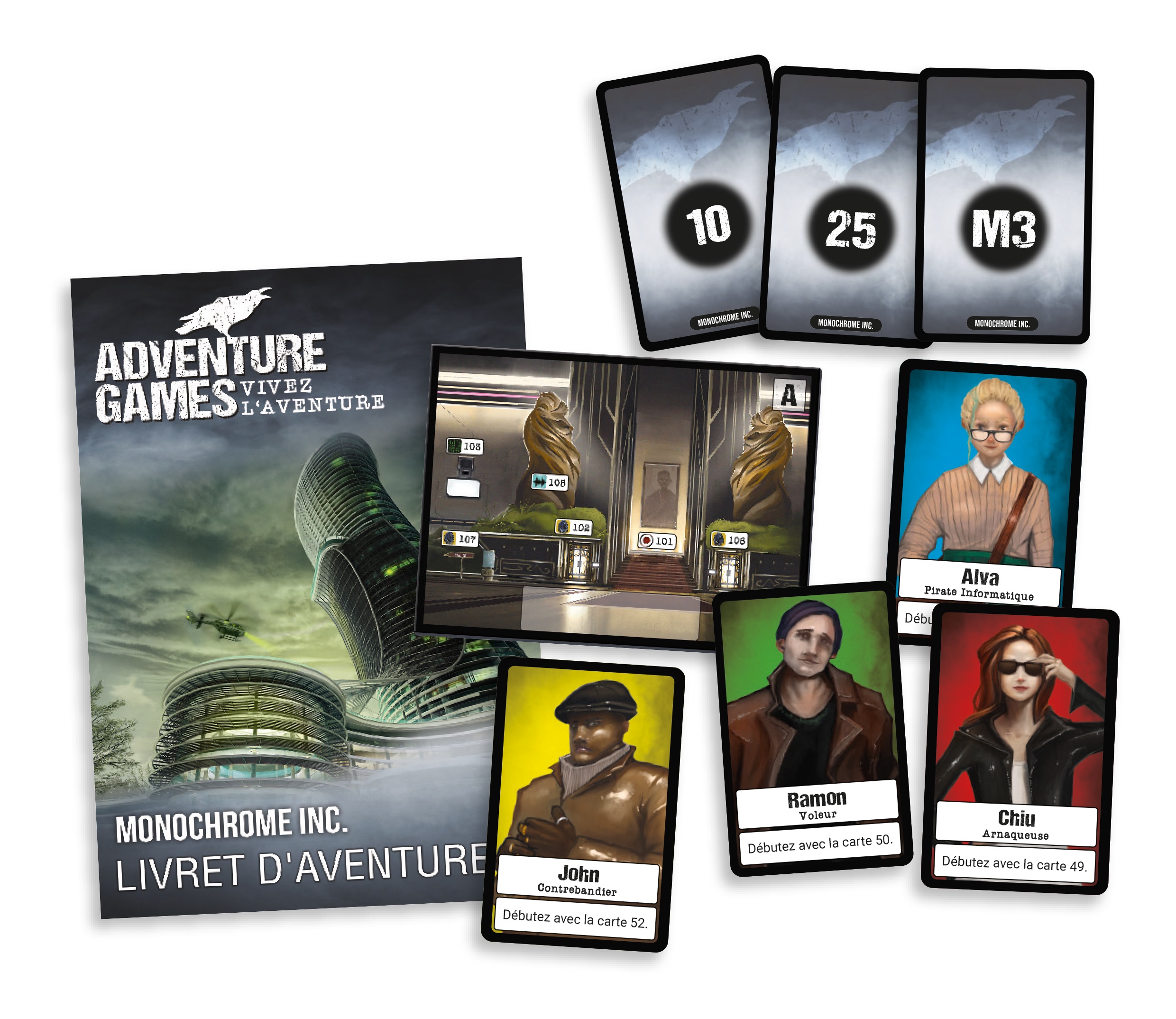 Vous êtes parvenus à vous infiltrer au cœur des installations de Monochrome Inc., un groupe pharmaceutique aux sombres secrets... Désormais, c’est à vous de décider des actions à mener ! Vivez une incroyable aventure dans un format ultra compact ! Adventure Games, c’est une nouvelle série de jeux qui associe l’esprit des livres jeux d’aventures et des jeux vidéo « point and click ». Dans la série Adventure Games, l’équipe des joueurs se déplace de lieu en lieu en lisant les paragraphes du livret et en formant progressivement un plan au moyen des cartes du jeu. Chaque lieu découvert propose plusieurs issues, mais aussi des objets intéressants. Chaque objet peut être utilisé tel quel… mais aussi associé avec un autre pour créer un nouvel outil et ainsi élargir ses possibilités de jeu ! Il faudra donc faire preuve d’ingéniosité, mais aussi d’imagination, afin de mettre à jour les sombres agissement de ce mystérieux laboratoire. Une aventure coopérative à partager… ou à jouer solo ! De paragraphe en paragraphe, de carte en carte les joueurs progressent, débloquent des situations et découvrent de nouveaux lieux et de nouveaux objets, leur permettant toujours davantage de combinaisons. Il est bien entendu possible de sauvegarder sa partie à tout moment pour suivre l’aventure à son rythme et jouer selon vos envies. Chaque scénario « Adventure Games » est bien entendu unique et truffé de rebondissements palpitants. Invitez les joueurs à découvrir un jeu d’exploration totalement inédit avec des mécanismes particulièrement ingénieux, pour de longues heures d’aventure et de craft qui sauront titiller les imaginaires !