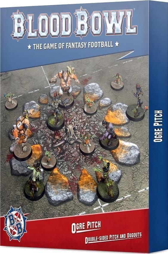 En anglais. Ogre stadia would be ruggedly handsome, nestled high up in the mountains as they often are, were it not for the bloodstains and craters full of picked-over bones. If you’re into that sort of thing, it’s extremely pretty. If not, they can be a little less than welcoming. One side of this pitch features a barren, rocky field, dominated by a toothy ogre-faced pit filled with the remains of their last team, or meal, as they like to call it. The other side features the same pitch, but covered in snowfall after a winter blizzard, with some ominous red ‘markings’ for the End Zones… You’ll also find a pair of matching double-sided dugouts to complete the theme. Redesigned for the latest edition of the game, each dugout features score, turn, and re-roll trackers, plus Reserves, Knocked-out, and Casualty boxes. Rules to use each side of the pitch are included.