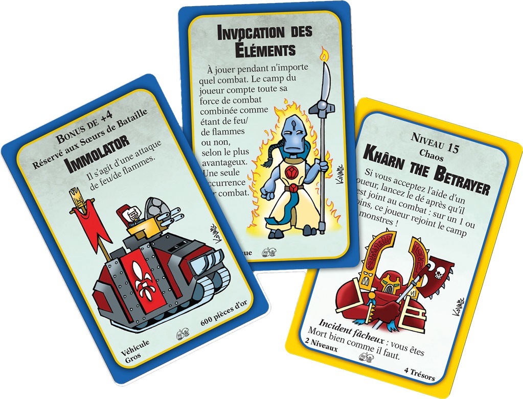 Dans Les Flingues de la Foi, deux nouvelles factions/armée font leur apparition sur les champs de bataille. Les Sœurs de Bataille, guidées par la foi, disposent de deux capacités. Actes de Foi leur permet de gagner +1 au combat pour chaque carte Trésor dans votre main. Bouclier de la foi vous autorise à défausser depuis votre main face à une malédiction, plutôt que depuis vos cartes en jeu. L’autre armée qui fait son apparition est celle des T’au, grands diplomates… quand c’est possible. Et forcément, à Munchkin, ça ne l’est pas ! Grâce à leur Supériorité technologique, ils peuvent ignorer les restrictions « réservé aux… » sur les cartes Objet. Avec Le Bien Suprême, votre générosité est récompensée si vous avez donné ou défaussé une carte par Charité, puisque vous piochez une carte Trésor face cachée. Les 112 cartes contiennent également de nouveaux monstres : Bête de Nep’Tan, Techpriest, Frelon Vespide, Ironstrider Ballistarius, ou le terrible Shim’Dre’Lex’Kazar !