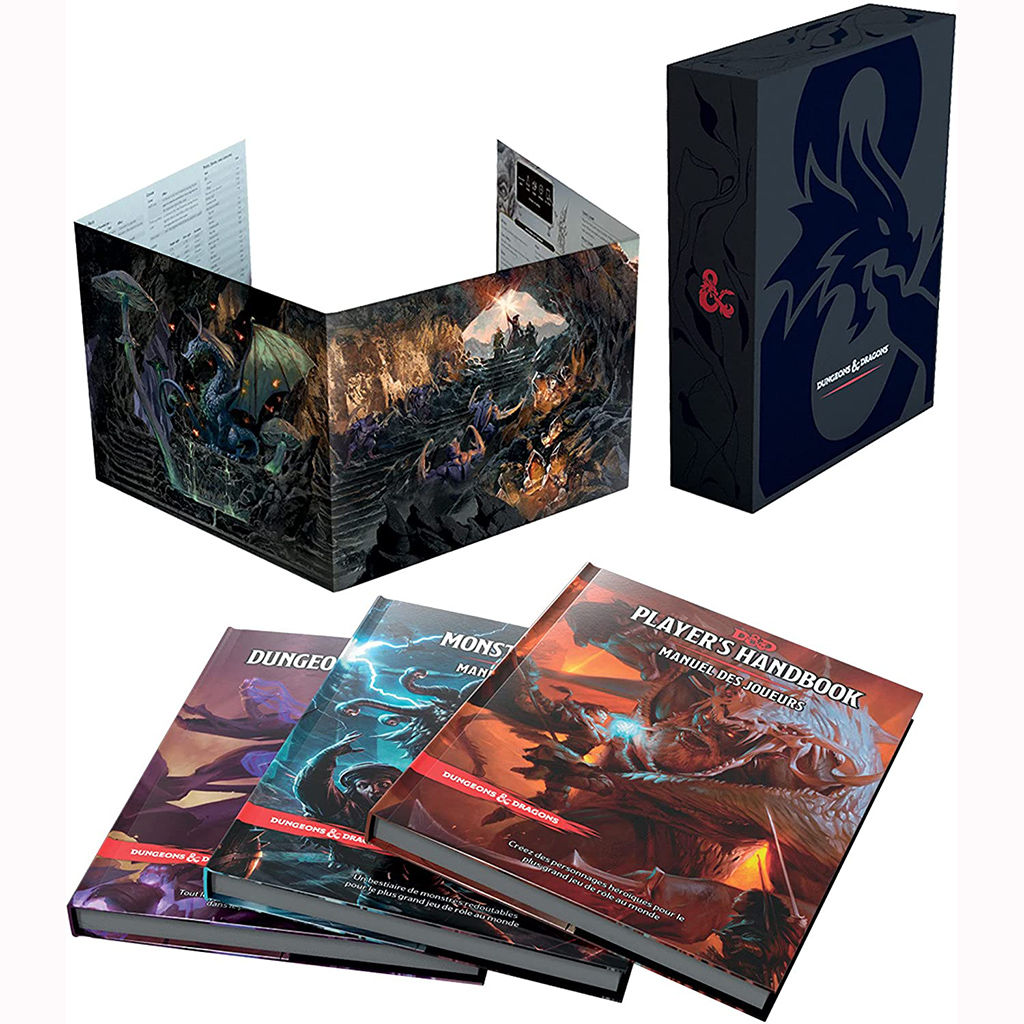 Pour un achat en ligne et l’envoi par La Poste de cet opus, merci de nous contacter au 02 51 84 05 05 Un superbe coffret contenant les trois pierres angulaires des règles de D & D 5ème édition : Le Player’s Handbook, le Dungeon Master Guide et le Monster Manual, le tout en français et dans leur version révisée. Le coffret contient également l’écran du maître de jeu, en 4 volets format panoramique.