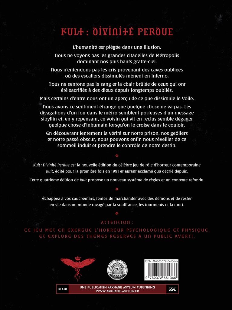 L’humanité est piégée dans une illusion. Nous ne voyons pas les grandes citadelles de Métropolis dominant nos plus hauts gratte-ciel. Nous n’entendons pas les cris provenant des caves oubliées où des escaliers dissimulés mènent en Inferno. Mais certains d’entre nous ont un aperçu de ce que dissimule le Voile. Nous avons ce sentiment étrange que quelque chose ne va pas. En découvrant lentement la vérité sur notre prison, nos geôliers et notre passé obscur, nous pouvons enfin nous réveiller de ce sommeil induit et prendre le contrôle de notre destin. Kult : Divinité Perdue est la nouvelle édition du célèbre jeu de rôles d’horreur contemporaine, édité pour la première fois en 1991 et autant acclamé que décrié depuis. Cette quatrième édition propose un nouveau système de règles et un contexte refondu. Échappez à vos cauchemars, tentez de marchander avec des démons et de rester en vie dans un monde ravagé par la souffrance, les tourments et la mort.