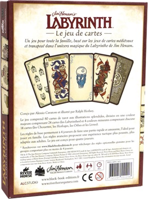 Un jeu pour toute la famille, basé sur les jeux de cartes médiévaux et transposé dans l’univers magique du Labyrinthe de Jim Henson. Le jeu comprend 80 cartes de tarot aux illustrations splendides, divisées en une couleur majeure comprenant 24 cartes (les Labyrinthes) et 4 couleurs mineures comprenant chacune 14 cartes (les Chouettes, les Horloges, les Orbes et les Livres). Les règles de base permettent à 4 joueurs de faire une partie rapide et amusante, l’idéal pour jouer en famille. Les règles avancées proposent une expérience tactique plus poussée, plus adaptée aux adultes. Le jeu est conçu pour quatre joueurs.