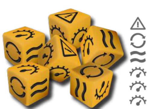 6 Dés de Combat de 15 mm personnalisés spécialement pour Gaslands : Refuelled. Le symbole explosif remplace le « 6 » et met en valeur les touches critiques de vos attaques !