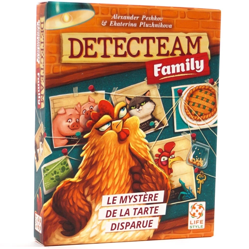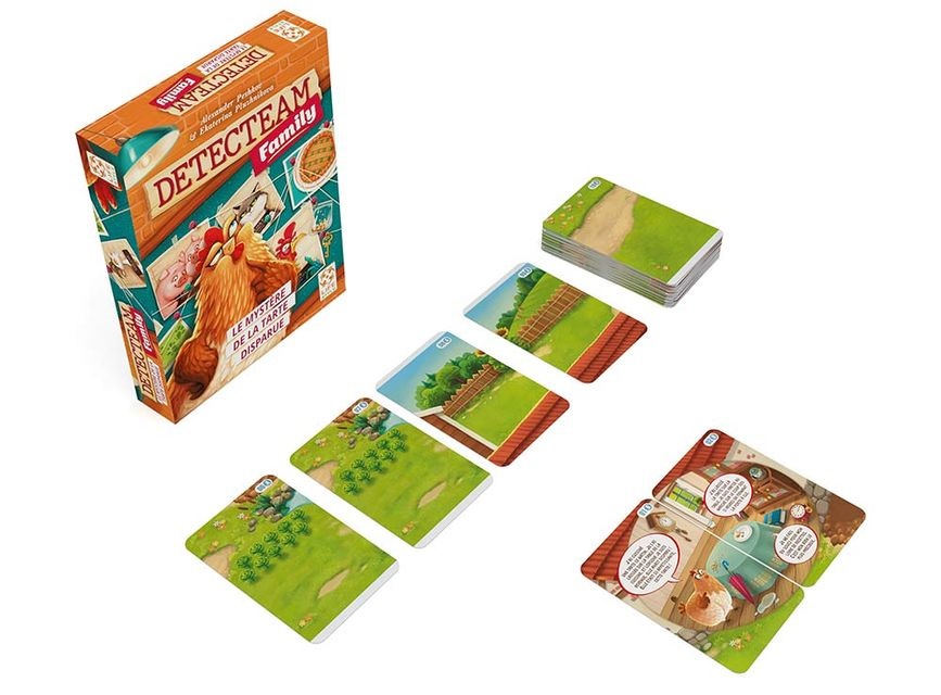 Le Mystère de la Tarte Disparue est une aventure coopérative pour toute la famille. Connectez les cartes contenant des informations importantes pour reconstituer le puzzle ! Résolvez le mystère de ce jeu appartenant à la gamme Detecteam Family. Mais que ce passe t il à la ferme ? La tarte que la poule a cuisiné ce matin a disparu. N’importe quel animal de la ferme pourrair être lié à cet incident... Le Mystère de la Tarte Disparue est une enquête coopérative pour toute la famille. Connectez les cartes contenant des informations importantes pour reconstituer le puzzle ! Soyez attentif aux détails ! Parlez aux animaux de la ferme et découvrez ce qu’ils savent ! Attention aux fausses pistes, vous devez décider quelles cartes peuvent vous aider à résoudre l’affaire de la tarte disparue... Les joueurs choisissent les cartes et les assemblent pour dresser un tableau complet de ce qui est arrivé à cette fameuse tarte. Vous devrez répondre à quelques questions et décrire ce qui s’est passé et pourquoi. À la fin du jeu, vous obtenez des points pour les réponses correctes et les cartes correctement placées. Jouez en équipe, enquêtez et résolvez cette affaire !