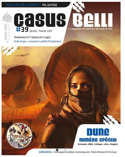 Au sommaire : Shadowrun 6, Cyberpunk, Logos, Aide de jeu : crossover Laelith/Shadowrun, Numéro spécial Dune (scénario, bâtisses et artifices, critique, rétro, étagère), Scénarios : Chroniques Oubliées Contemporain, Terre d’Arran, Chroniques Oubliées Fantasy, une aventure en solo dans le Paris des merveilles de Pierre Pevel, etc…