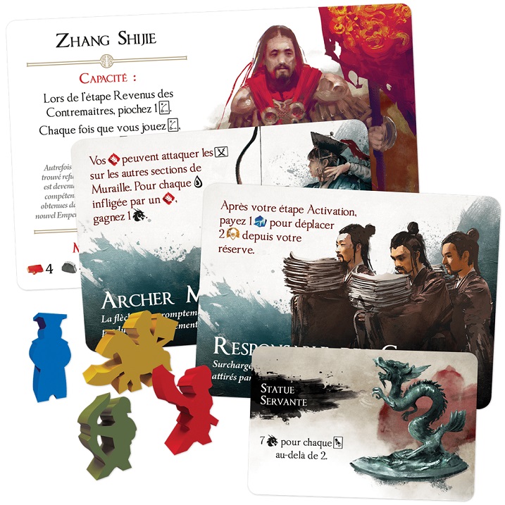 Le Pays du Milieu a fait appel à ses meilleurs généraux pour défendre sa frontière face à un péril constant : les Hordes Mongoles. Incarnez ces chefs de Clan qui doit contrer des vagues d’ennemis, qui s’amassent aux pieds de la puissante et Grande Muraille de Chine. Chacun dispose de forces et de tactiques qui lui sont propres, mais leur objectif est le même : vaincre les Mongols… Et les autres ! The Great Wall est un jeu asymétrique de placement d’ouvriers, épique et tendu. Si la coopération est nécessaire pour que la Grande Muraille tienne, il faut garder à l’esprit qu’il n’y aura qu’un seul vainqueur ! De plus, les différences entre chaque Clan sont de plus en plus criantes au fur et à mesure que les Saisons, puis les Années, passent.