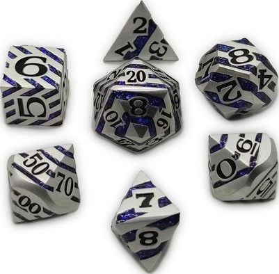 Ce set de dés est composé de 7 dés pour les jeux de rôles (JDR). Ils sont de haute qualité et fait en métal (zinc) et résine. La fabrication est complexe et longue car il mélange deux matières. Elle demande précision et savoir faire. Le set comprend : - 1 dé à 4 faces - 1 dé à 6 faces - 1 dé à 8 faces - 1 dé à 10 faces (dizaines) - 1 dé à 10 faces - 1 dé à 12 faces - 1 dé à 20 faces