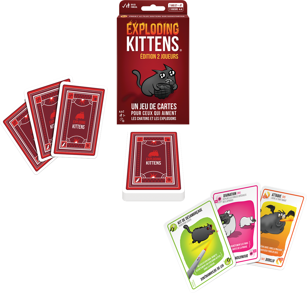 Le paquet contient une Carte Exploding Kitten. Vous jouez à tour de rôle en tirant des cartes jusqu’à ce que l’un de vous pioche le Chaton Explosif (Exploding Kitten). Lorsque cela se produit, ce joueur explose. Il meurt et est éliminé, son adversaire remporte la partie. Toutes les autres cartes ont des effets redoutables qui vous aideront à éviter d’exploser et à faire exploser votre adversaire ! À chaque tour, jouez une de vos huit cartes et appliquez son effet, ou passer. Dans tous les cas, piochez une nouvelle carte. Si vous tirez le Chaton explosif, vous perdez, à moins de posséder un kit de désamorçage, par exemple. Une version deux joueurs du bestseller de Matthew Inman Contenu 32 cartes, une règle
