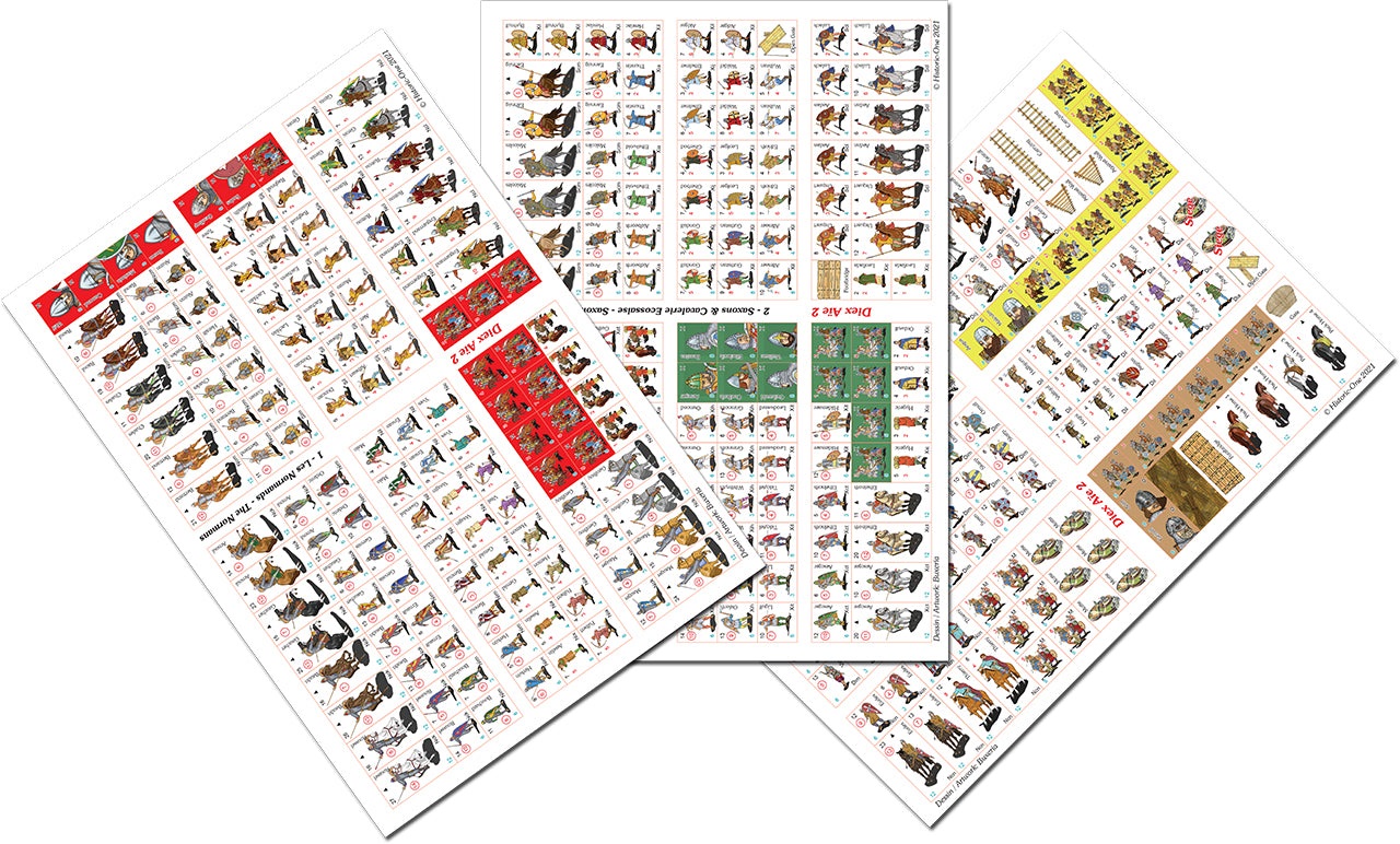 3 planches A4 recto-verso sur carton épais représentant des Normands, des Saxons, des Ecossais et des Danois du XIe siècle. Composant du jeu DIEX AÏE 2