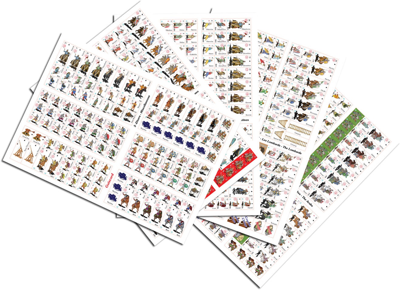 5 planches A4 recto-verso sur carton épais représentant des Normands, des Byzantins, des Lombards, des Arabes, des Allemands et la Garde Varangienne des empereurs byzantins.