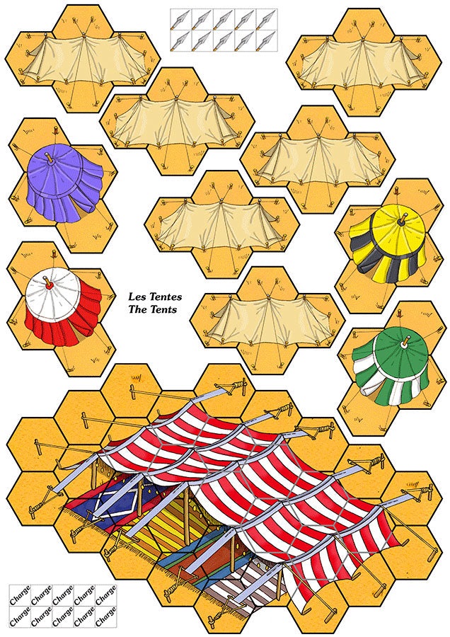 Formes à découper imprimées sur papier fort A4 représentant différentes tentes, dont la grande tente d’un émir. Composant du jeu AGER SANGUINIS