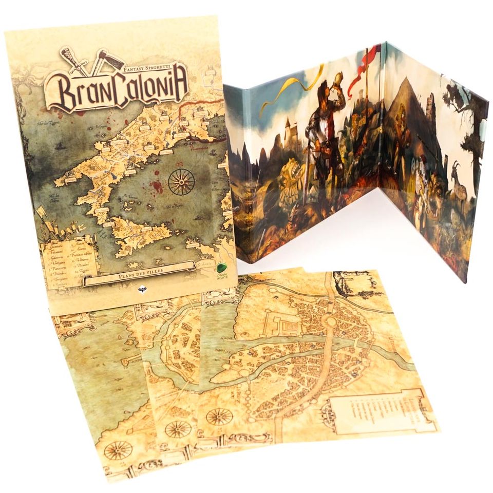 Ce kit comprend un écran avec au recto une illustration de Lorenzo Nuti, qui représente une clique de Canailles, et au verso des rappels et des tables pour les règles spécifiques à l’univers de Brancalonia (prises et gnons, primes et notoriété, risques du métier, accommodations de repaire…), et les cartographies du royaume.