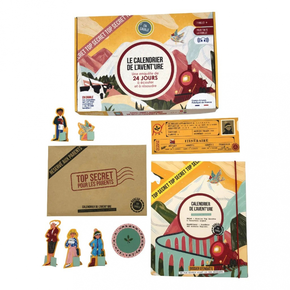 Le Calendrier de l’Avent’Ure - Opération À Toute Vapeur est une enquête familiale de 24 jours, avec un décor à manipuler, une histoire à écouter au quotidien et autant d’énigmes à résoudre pour patienter jusqu’au jour J. Une enquête fantastique au coeur de l’Académie des Enfants Espions sur le thème du train, pensée pour petits et grands voyageurs dès l’âge de 7 ans. Bienvenue à bord de l’"Opération À Toute Vapeur" ! L’Agent A.S.T.R.A.U.X., enquêtrice confirmée de l’Académie des Enfants Espions, est contactée de toute urgence pour effectuer une mystérieuse mission Top Secrète : elle a 24 jours pour accompagner 2 enfants (et un oiseau) très spéciaux en train vers une destination inconnue. À bord du Transmerveilleux Express, l’Agent A.S.T.R.A.U.X. et les Enfants Espions partent à la rencontre de personnages hauts en couleurs, explorent de nouveaux paysages et s’apprêtent à vivre bien des péripéties. Une chose est sûre : cette Avent’Ure leur réserve bien des surprises ! - Un décor 3D avec un livre pop up, - une planche personnages, - du matériel d’enquête, - 24 épisodes audio à écouter, - 24 cases à ouvrir