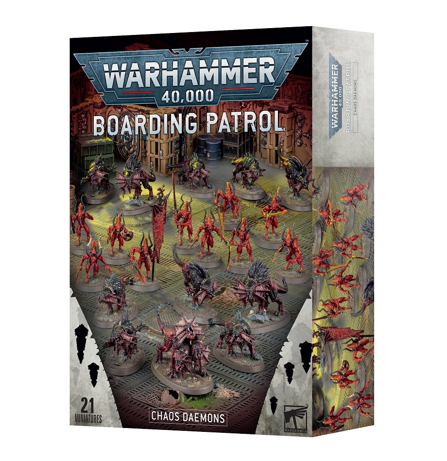 Les serviteurs démoniaques de Khorne se déversent depuis la folie du warp pour corrompre et massacrer, cherchant des proies de valeur pour assouvir leur rage inapaisable. Les recoins exigus d’un vaisseau spatial ou d’un antique space hulk ne fournissent aucune protection contre leurs déprédations : lorsque les champs de Geller vacillent, des pans entiers de coque se déforment au contact du Chaos. Déchirant le voile de la réalité, les légions démoniaques du Dieu du Sang massacrent des équipages entiers dans leur sinistre quête visant à noyer les étoiles dans le sang. La Patrouille d’Abordage : Démons du Chaos fournit une force de démons de Khorne centrée sur le combat en mêlée, idéale pour démembrer vos ennemis dans les parties de Warhammer 40,000, et plus particulièrement dans les mortelles missions d’Actions d’Abordage détaillées dans la série des Arches Fatidiques. Elle vous permettra en outre de faire des économies par rapport à un achat des kits au détail. Menées par l’insatiable Karanak, le Molosse de la Vengeance, manifestation physique de la rage du Trône de Crânes, deux meutes de cinq Molosses de Khorne se ruent dans les coursives en traquant l’odeur de leur proie. Ils sont suivis par 10 Sanguinaires, les fantassins de Khorne, poussés par leur inapaisable soif de sang et leur instinct meurtrier inégalé tandis qu’ils découpent leurs ennemis en combat rapproché. Ce set contient les figurines suivantes : - 1x Karanak, le Molosse de la Vengeance - 10x Molosses de Khorne - 10x Sanguinaires Cette boîte permet d’assembler des unités diverses – l’assemblage recommandé pour les parties d’Actions d’Abordage Karanak, 2 unités de 5 Molosses de Khorne, et et une unité de 10 Sanguinaires. Toutes les figurines sont fournies avec leurs socles appropriés. Ces figurines sont fournies non peintes et nécessitent assemblage. Les règles permettant de jouer des parties d’Action d’Abordage à Warhammer 40,000 sont disponibles dans le supplément Les Arches Fatidiques : Abaddon. Des règles additionnelles pour les Patrouilles d’Abordage des Démons du Chaos sont disponibles dans Les Arches Fatidiques : Vashtorr.