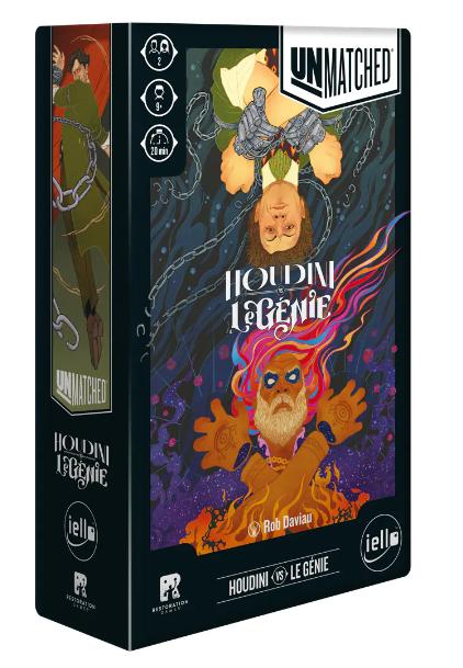 Houdini, le Roi de l’évasion, contre Le Génie de la lampe : c’est l’incroyable affiche de cette nouvelle boîte Unmatched qui permet de s’essayer à de nouveaux styles de combat, aussi différents que captivants à jouer. Houdini, c’est l’esquive, la disparition et la réapparition, la maîtrise du terrain et des nombreux tours de magie qu’il réserve à ses adversaires… pour mieux les surprendre au moment où ils s’y attendent le moins. Le Génie, c’est la puissance d’exaucer les vœux, tout simplement. Des action supplémentaires ? Des cartes à piocher ? Regagner de la vie ? Forcer l’adversaire à défausser des cartes ? Vous le nommez, vous l’avez. Mais prenez-garde à ne pas épuiser prématurément votre énergie… et votre deck de cartes, dans cette toute puissance qui vous tend les bras ! L’univers Unmatched s’étoffe encore ! Comme toujours, ces nouveaux combattants sont 100% compatibles avec l’univers Unmatched, pourtant le nombre à 18 combattants disponibles en français, que vous pouvez associer selon vos envies. Houdini contre Sherlock Holmes ? Le Génie contre Beowulf ? Faites vous plaisir et mélangez toutes les boîtes Unmatched pour des affrontements toujours plus uniques… et férocement asymétriques !