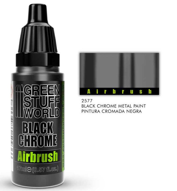 Peinture Chromée Noire La peinture Black Chrome est à base d’alcool et a été conçue pour créer un effet miroir qui imite la réflexion d’une surface chromée. Ce type de peinture est conçu pour être utilisé uniquement avec un aérographe et doit être appliqué sur des surfaces brillantes, de préférence noires ou très foncées, afin d’obtenir l’effet désiré. Il est important de noter qu’une base mate ou des couleurs claires ne permettront pas d’obtenir un reflet miroir. Si des encres ou des vernis sont ajoutés par-dessus, l’effet miroir peut être réduit ou perdu. Après application et séchage complet, il peut être nécessaire de polir la surface à l’aide d’une brosse douce, d’une éponge, d’un coton-tige ou d’un chiffon pour accentuer et mettre en valeur les reflets du miroir. Utilisez-le pour créer un effet métallique unique et saisissant sur les figurines, en particulier celles à thème futuriste ou de science-fiction. Contenu : 1 flacon compte-gouttes de 17ml Black Airbrush Chrome Paint - Valable pour l’aérographe.