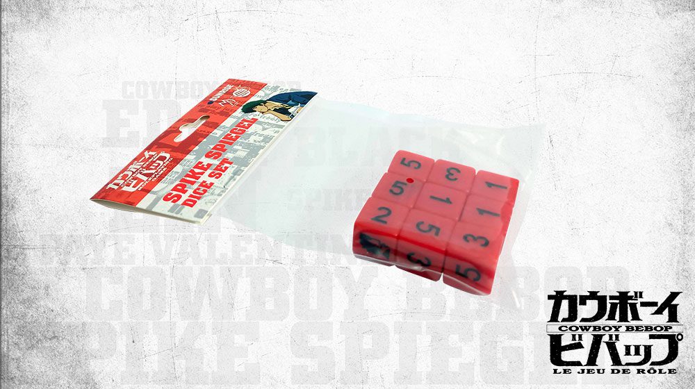 Dés pour le jeu de rôle Cowboy Bebop. Grâce à ces dés les Chasseurs et Chasseuses de Primes de tout l’univers pourront foncer vers de nouvelles aventures !