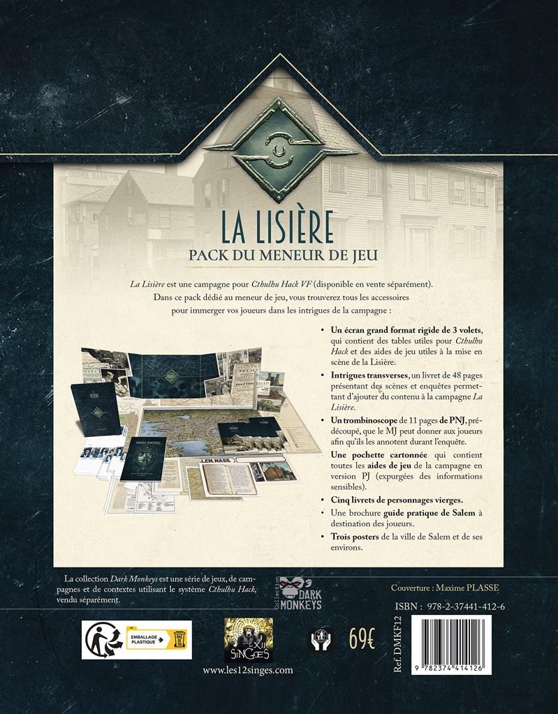 La Nouvelle Angleterre de Lovecraft La Lisière est une campagne et un contexte de jeu se déroulant dans les années 20 à Salem et dans ses environs. Il se compose de trois éléments. La campagne se compose de 7 scénarios se déroulant autour d’un rituel remontant au XVIIe siècle. Le guide de Salem est indispensable à la campagne, mais peut être utilisé pour tout autre jeu, car il ne contient pas de termes techniques. Le pack contient un écran 3 volets, des aides de jeu, un trombinoscope, deux plans, etc.