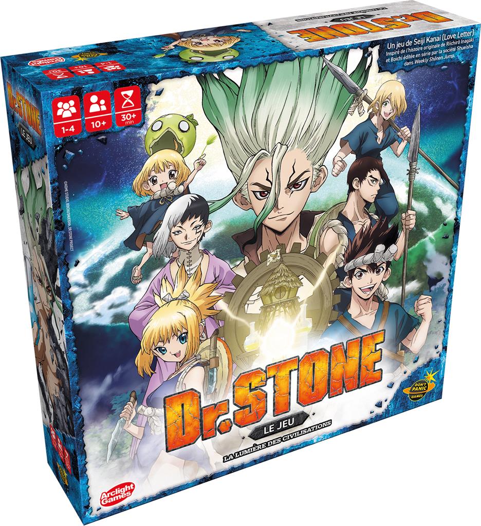 Venu d’une civilisation beaucoup plus avancée, Senku possède des connaissances et des compétences scientifiques. Au même moment, Ruri, la prêtresse vénérée du village, souffre d’une maladie mystérieuse, mais pourrait être sauvée en produisant de l’électricité. Dr Stone est un jeu coopératif. Il sera difficile de gagner votre première partie, mais les défaites vous aideront à emprunter le chemin de la réussite. Au fur et à mesure des épisodes, la difficulté ainsi que le nombre de tâches à accomplir augmenteront. Chaque joueur incarne un personnage et a pour mission de rapporter des éléments éloignés du village à Senku. Vous transformerez ces éléments jusqu’à l’obtention de l’objet requis pour clore chaque épisode. Pendant ce temps, Shishio Tsukasa et ses sbires vous guetteront car eux ne souhaitent pas le renouveau de la civilisation. Prenez garde, ils pourront vous attaquer à tout moment ! De plus, si vous dépassez le temps imparti, vous échouez. Au fil des épisodes, vous apprendrez à transformer les cartes Matériaux pour créer de nouvelles cartes Objet. Contenu 1 plateau de jeu, 58 cartes (Episode, Matériaux, Objet, Personnage), 6 tuiles Personnage, 6 socles, 18 jetons, 3 tuiles installation, 3 tuiles X, 5 dés, 1 livret de règles